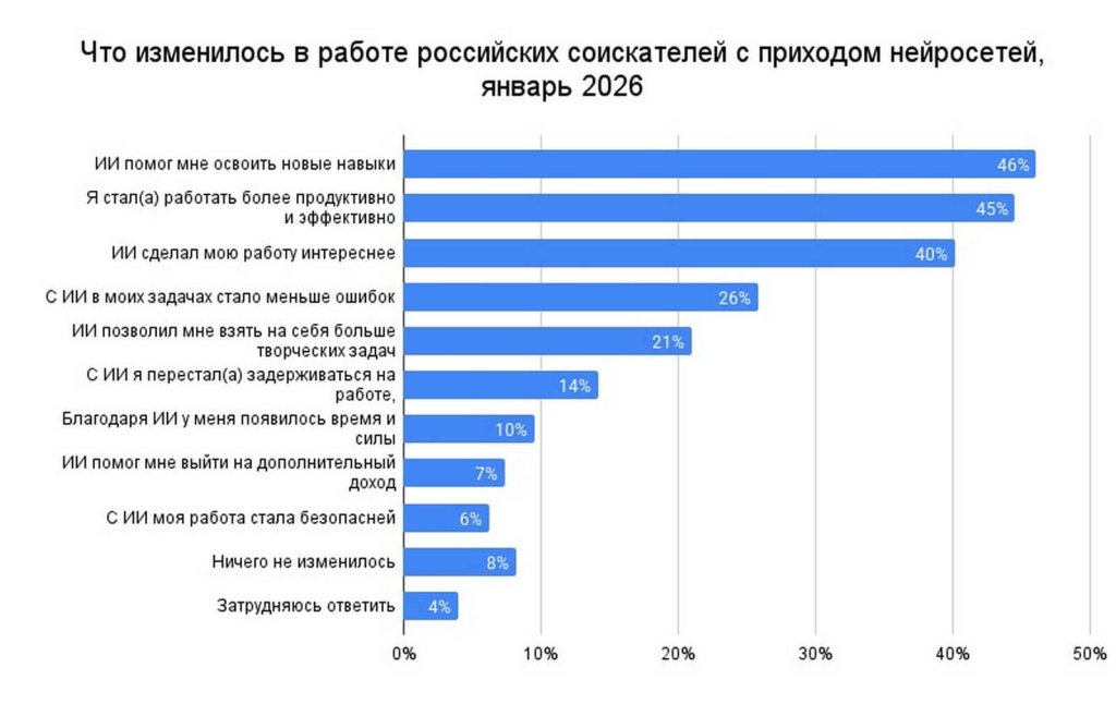 Также 46% опрошенных признались, что искусственный интеллект помог им освоить новые навыки, необходимые им для работы и карьеры, а 45% респондентов заметили, что с помощью нейросетей стали работать более продуктивно и эффективно. Для 40% россиян ИИ сделал работу интереснее. Более того, 26% участников опроса отмечают, что с помощью нейросетей они, наоборот, стали допускать меньше ошибок в рабочих задачах и больше всего этот плюс для себя отметили работники сферы финансов и бухгалтерии (сразу 41% представителей).