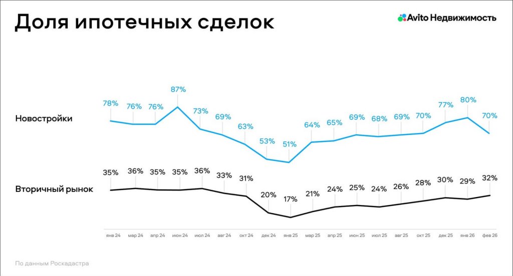 По данным технологической платформы Авито Недвижимость, в феврале 2026 года на вторичном рынке доля ипотечных сделок выросла и составила 32% (+3 п.п. за месяц) — это максимум с осени 2024 года. В то же время на первичном рынке жилья доля сделок с использованием ипотеки снизилась до 70% (-10 п.п. за месяц). Так рынок отреагировал на вступление в силу изменений по программе «Семейная ипотека».