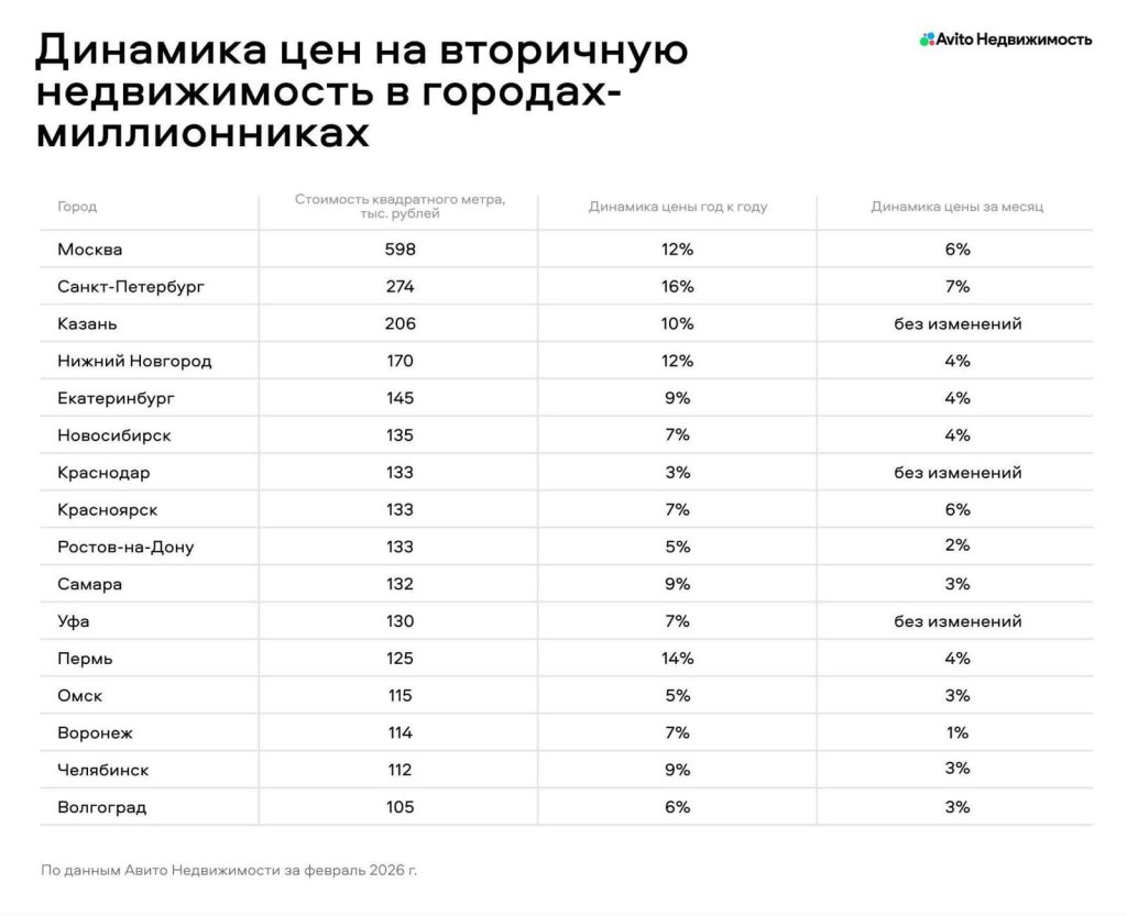 Среди пользователей Авито Недвижимости самыми популярными городами в феврале 2026 года по интересу к приобретению вторичного жилья стали Санкт-Петербург, Москва, Краснодар, Ростов-на-Дону и Казань. Среди миллионников показатель год к году вырос в Красноярске (+18%), Омске (+17%), Екатеринбурге (+11%), Краснодаре (+9%), Челябинске (+8%), Новосибирске (+7%), Ростове-на-Дону (+5%), Санкт-Петербурге и Москве (+3% в каждом), а также в Нижнем Новгороде (+1%).