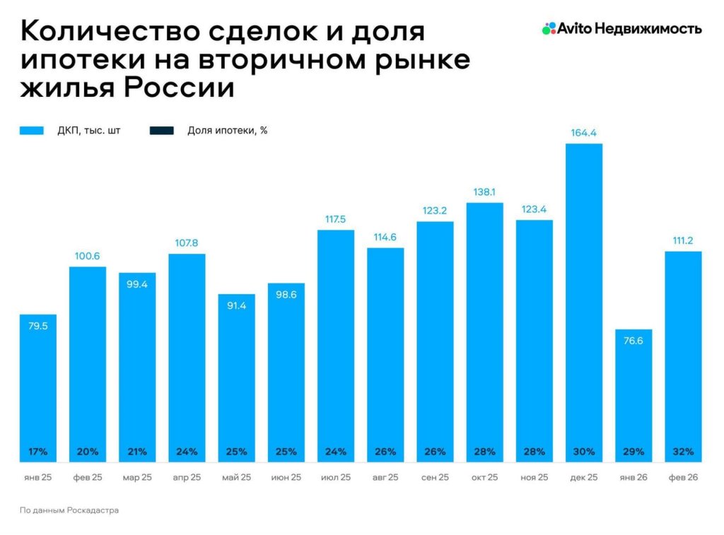 По данным технологической платформы Авито Недвижимость, в феврале 2026 года на вторичном рынке жилья заключили 111 тыс. ДКП : продажи по сравнению с тем же месяцем прошлого года выросли на 11%, а к январю прибавили 45%. Динамика отчасти объясняется длинными праздниками в начале года, когда деловая активность традиционно снижается.